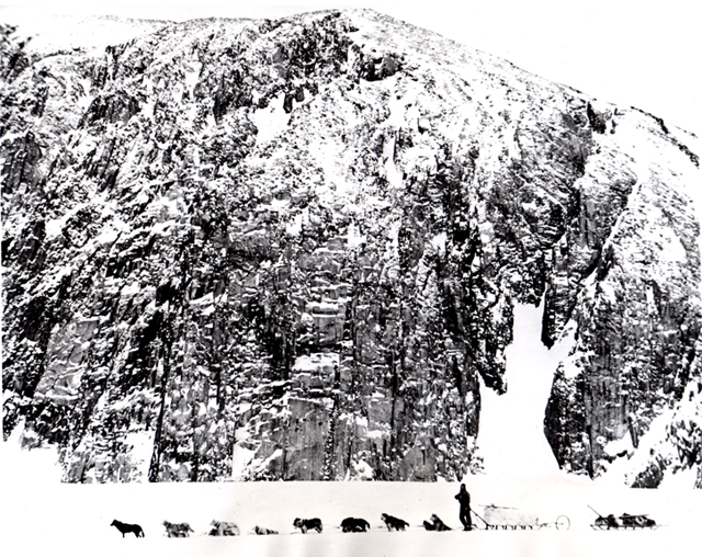 Official photograph U.S. Antarctic Service: Bleak Ramparts of the Antarctic. ANTARCTICAt the foot of one of the mountains which hide secrets of the polar region, Joseph D. Healy of Dorchester, Mass., member of the United States Antarctic Expedition, halts his sled team for a rest, while exploring the area. Note the sledge-meter wheel which records distance covered, an important instrument for polar travel. Members of the Expedition have returned from extensive exploration. 6/7/41