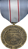In the center of a gold, silver, or bronze medallion one and a quarter inches in diameter, a design representative of the globe as viewed from below. At the top of the globe is a three-tiered scroll bearing the words, SCIENCE, PIONEERING, EXPLORATION. Below the scroll is the outline of the polar region, with the names SOUTH PACIFIC OCEAN, ANTARCTICA, SOUTH POLE, PALMERLAND, LITTLE AMERICA in very small letters. Forming a circle around this design, the words THE UNITED STATES ANTARCTIC EXPEDITION and the dates 1939 - 1941 at the base.